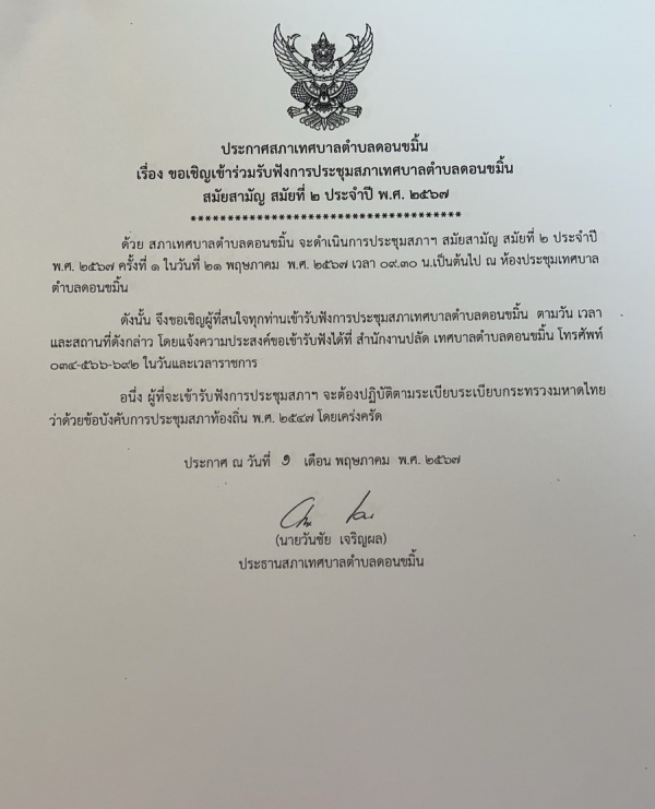 ขอเชิญประชาชนเข้าร่วมรับฟังการประชุมสภา สมัยสามัญ สมัยที่ 2 ปี 67