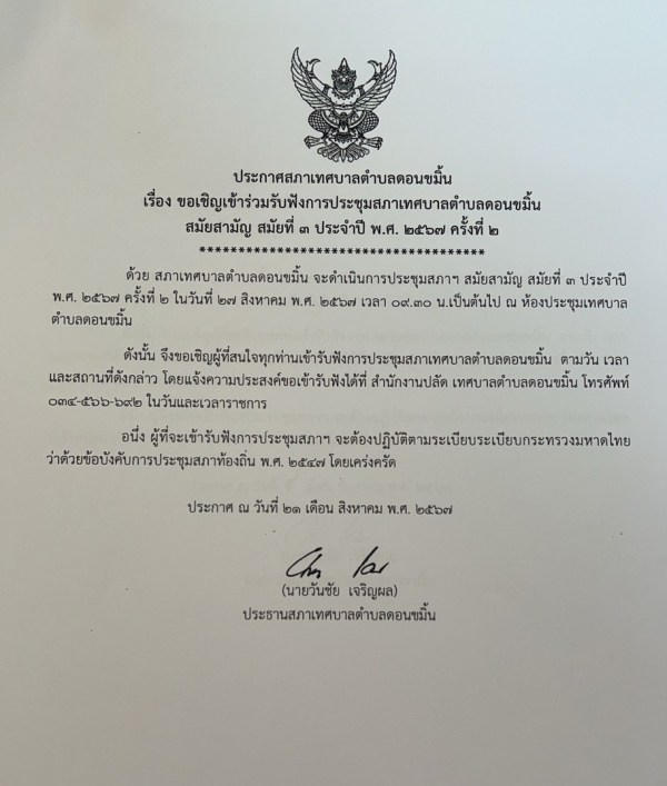 ขอเชิญประชาชนเข้าร่วมฟังการประชุมสภาสมัยสามัญ สมัยที่ 3 ครั้งที่ 1 ปี 2567