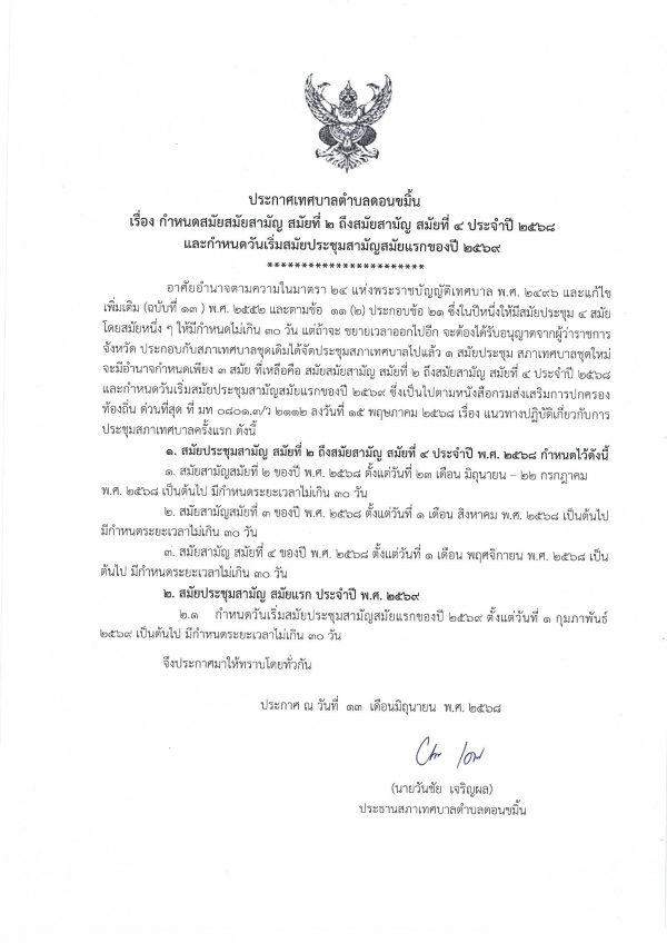 ประกาศกำหนดสมัยสามัญ สมัยที่ 2 ถึงสมัยสามัญ สมัยที่ 4 ประจำปี 2568