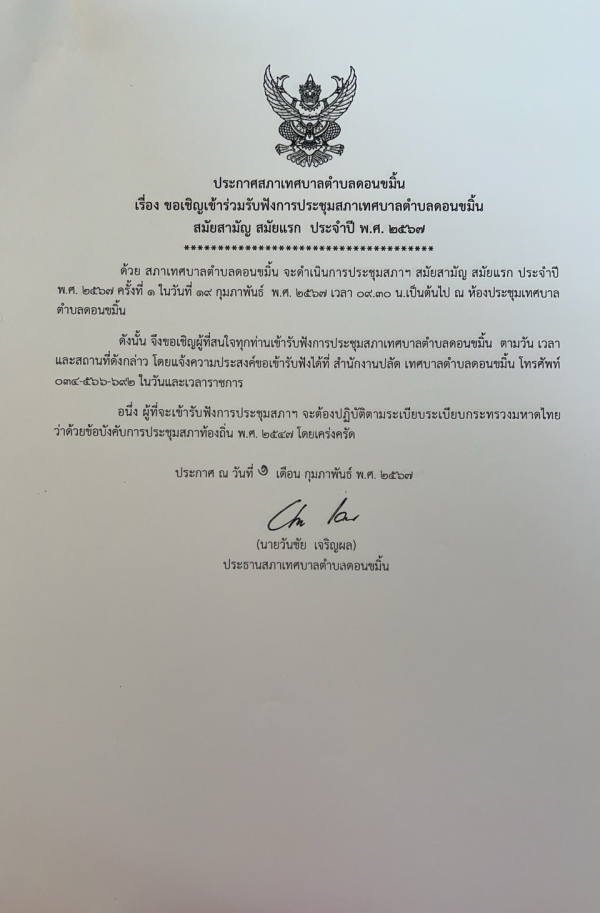 ขอเชิญประชาชนเข้าร่วมฟังการประชุมสภาสมัยสามัญ สมัยแรก ประจำปี 2567