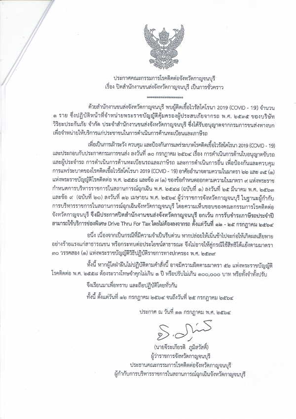 เรื่อง ปิดสำนักงานขนส่งจังหวัดกาญจนบุรี เป็นการชั่วคราว