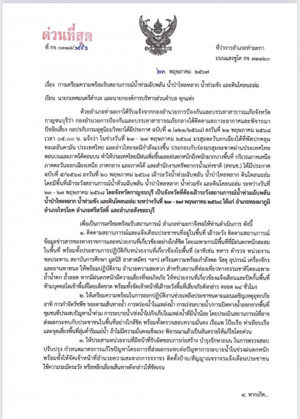การเตรียมความพร้อมรับสถานการณ์น้ำท่วมฉับพลัน น้ำป่าไหลหลาก น้ำท่วมขัง และดินโคลนถล่ม