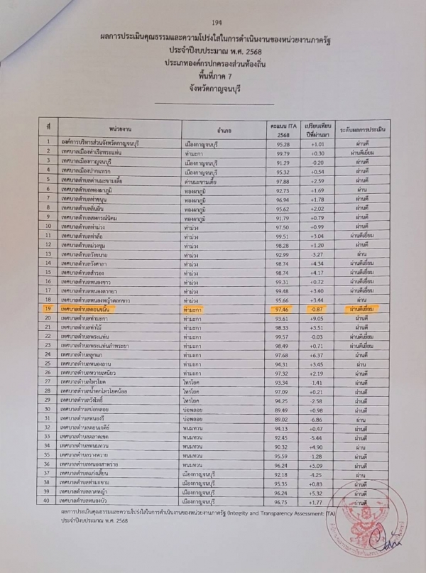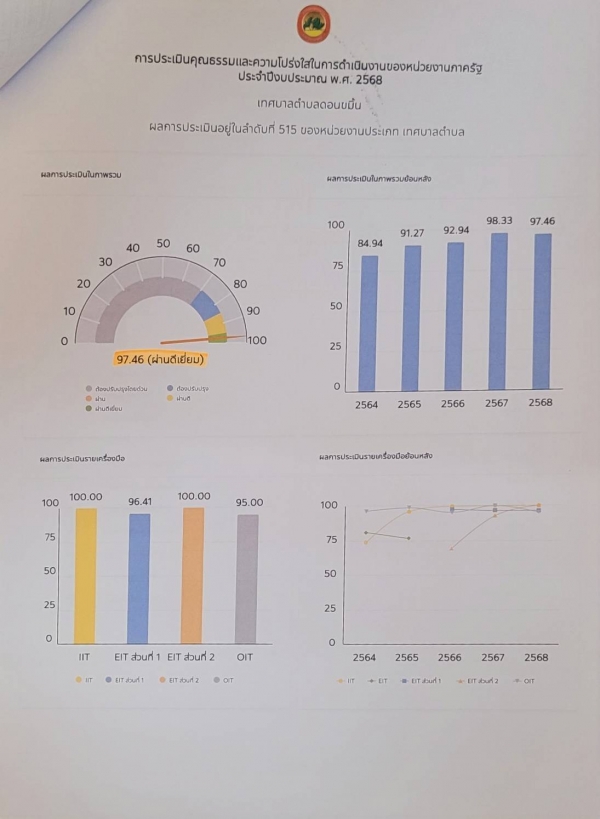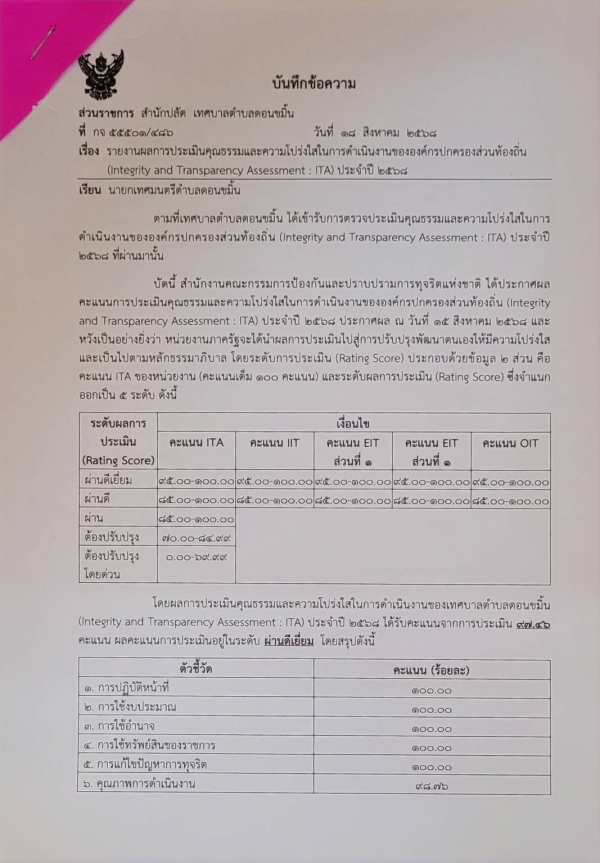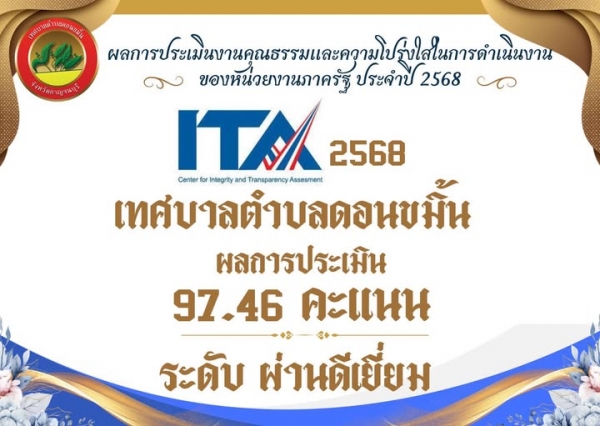 ประกาศสำนักงานคณะกรรมการป้องกันและปราบปรามการทุจริตแห่งชาติ เรื่อง ผลการประเมินคุณธรรมและความโปร่งใสในการดำเนินงานของหน่วยงานภาครัฐ (Integrity and Transparency Assessment : ITA) ประจำปีงบประมาณ พ.ศ. 2568 เทศบาลตำบลดอนขมิ้น ได้คะแนน 97.46 คะแนน ผลการประเมินระดับ ผ่านดีเยี่ยม