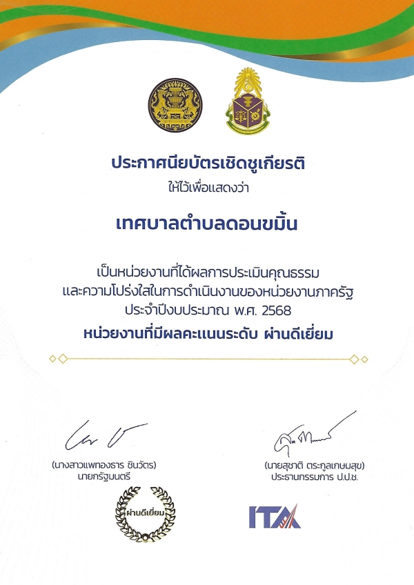 นายรุ่งโรจน์ ตันวัฒนวิทย์ นายกเทศมนตรีตำบลดอนขมิ้น ได้เข้ารับมอบประกาศนียบัตรเชิดชูเกียรติ ให้ไว้เพื่อแสดงว่า เทศบาลตำบลดอนขมิ้น เป็นหน่วยงานที่ได้ผลการประเมินคุณธรรมและความโปร่งใสในการดำเนินงานของหน่วยงานภาครัฐ ประจำปีงบประมาณ พ.ศ. 2568