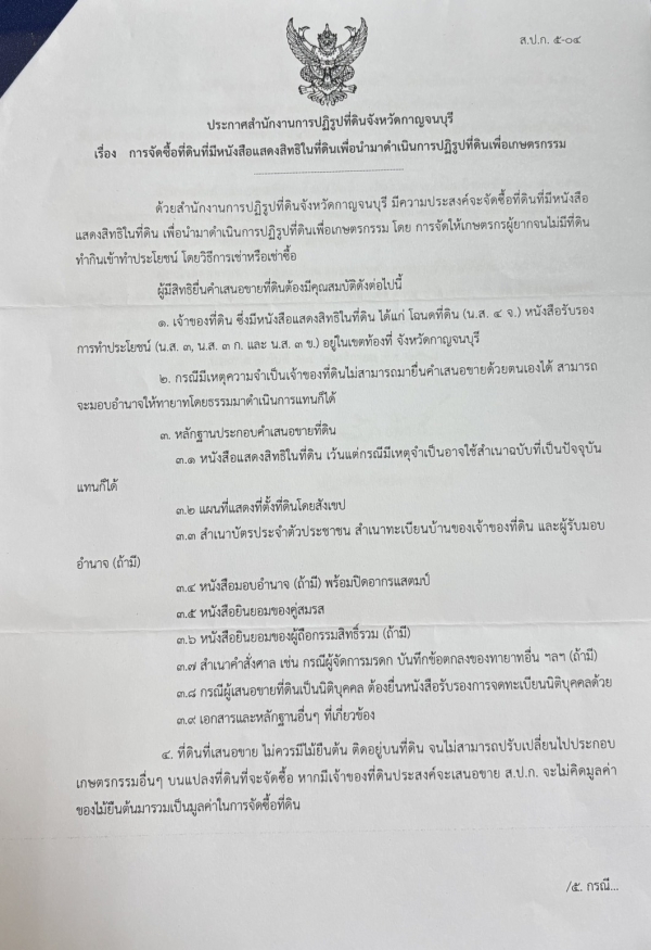 ประกาศสำนักงานการปฏิรูปที่ดินจังหวัดกาญจนบุรี เรื่อง การจัดซื้อที่ดินมีหนังสือแสดงสิทธิในที่ดินเพื่อนำมาดำเนินการปฏิรูปที่ดินเพื่อเกษตรกรรม
