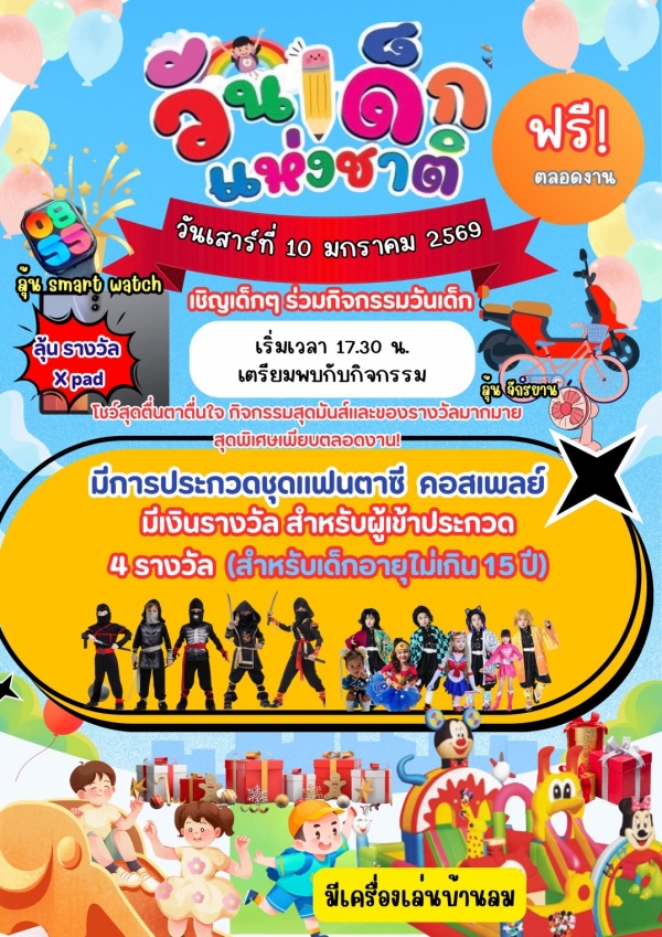 ขอเชิญชวนเที่ยวงานวันเด็กแห่งชาติ วันเสาร์ที่ 10 มกราคม 2569 เชิญเด็กๆ ร่วมกิจกรรมวันเด็ก เริ่มเวลา 17.30 น.