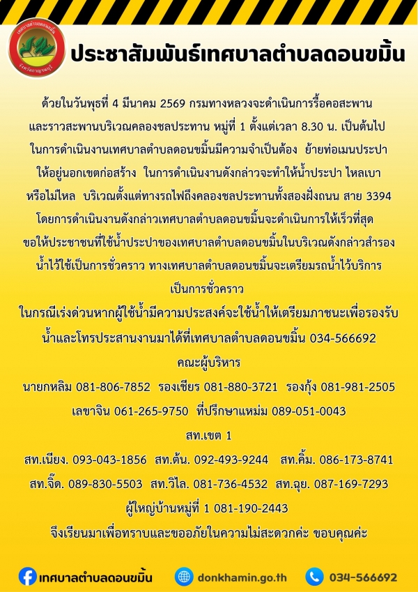 ประชาสัมพันธ์เทศบาลตำบลดอนขมิ้น ด้วยในวันพุธที่ 4 มีนาคม 2569 กรมทางหลวงจะดำเนินการรื้อ คอสะพาน และราวสะพานบริเวณคลองชลประทาน หมู่ที่1