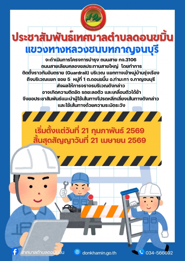ประชาสัมพันธ์เทศบาลตำบลดอนขมิ้น แขวงทางหลวงชนบทกาญจนบุรีจะดำเนินการโครงการบำรุง ถนนสาย กจ.3106